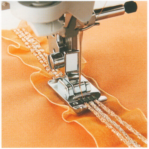 Šicí patka pro tkanice slouží ke zdobení okrajů manžet, límců a jiných částí oděvu našitím až 3 text..