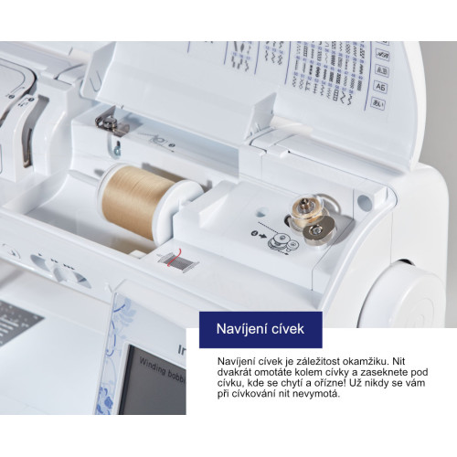 Stroj má rotační chapač - cívku nasazujete jednoduše shora, stroj se krásně čistí a je tichý. | Navíjení cívek je záležitost okamžiku. Nit dvakrát omotáte kolem cívky a zaseknete pod cívku, kde se chytí a ořízne!Už nikdy se vám při cívkování nit nevymotá. | |