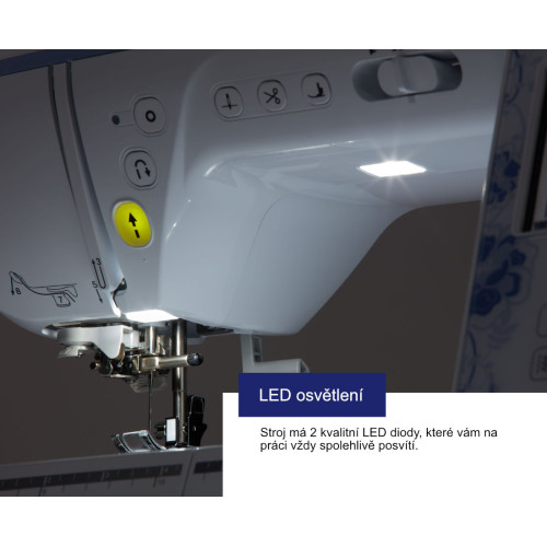 Oproti nižším modelům je zvětšený i displej, takže úprava výšivek je jednodušší. Navíc ovládání na displeji je česky. | LED patka pro přesné pozicování výšivek - s touto patkou v základní výbavě můžete sesadit výšivky s přesností na milimetr. | |