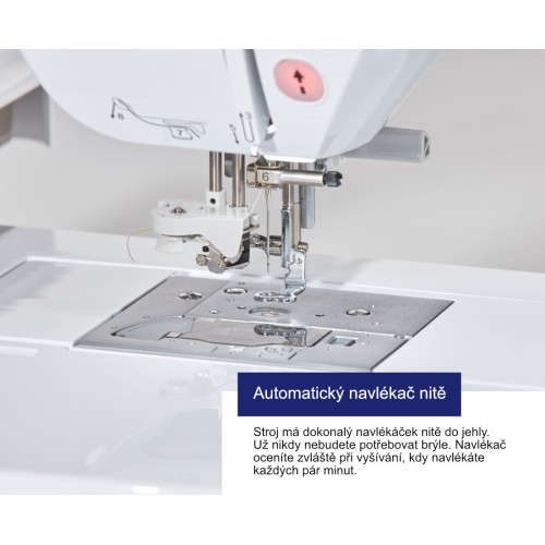 - Stroj má komfortní navlékání nitě, kdy na navlečení nitě do jehly pomocí navlékáčku vám stačí jeden prst!