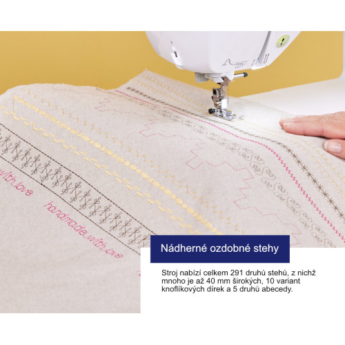 V nabídce má 291 různých stehových programů, 10 typů knoflíkových dírek + 5 fontů abecedy šité pod patkou. Můžete si také jakýkoliv vlastní steh jednoduše vytvořit!