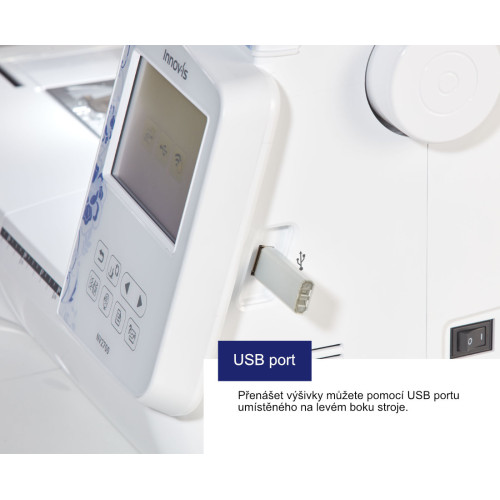- USB vstup na vložení výšivky do stroje