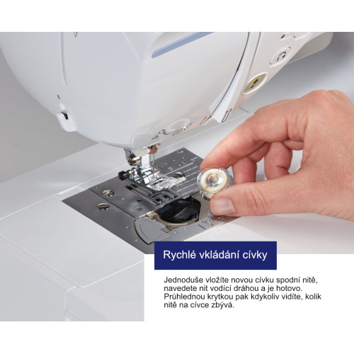 - Pro vyšívání a quiltování má stroj druhé cívkové pouzdro, které má z výroby nastavené vyšší napětí spodní nitě. Výšivky jsou tak plastické a spodní nit nevyleze na povrch látky.