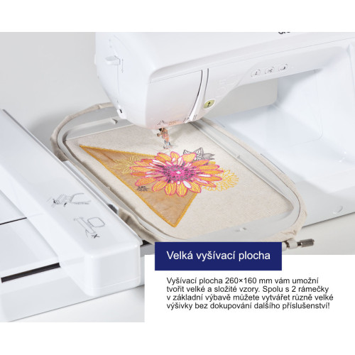 Tento model šicího a vyšívacího stroje má české ovládání a vyšívací plochu 160 x 260 mm.