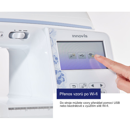 Fantastická novinka jsou české fonty přímo v paměti stroje. Na vyšití jmen obsahujících Ž nebo Š už nebudete potřebovat software. | Vyšívací vzory do stroje můžete nahrávat přes USB flash disk nebo nově bezdrátově pomocí Wi-fi připojení. | |
