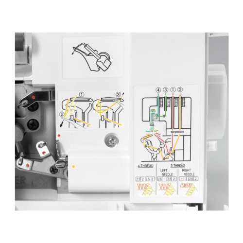 Rychlé a snadné navlékání - stačí pouze následovat barevné schéma. Každá cesta nitě má svoji specifickou barvu pro lehkou identifikaci. Jednoduše navlékněte nit podle barevného schématu.