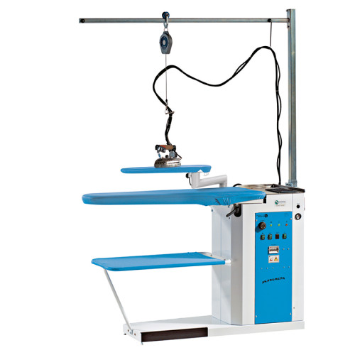 Žehlící prkno s typem desky 40x120 cm. Ideální pro čistírny. Odsávání a ofuk žehlící desky 0,37 kW, napařování desky (přívod páry z venku), vyhřívání povrchu desky 0,8 kW, výška pracovní plochy 92 cm, vyhřívaný a odsávaný rukávník 0,15 kW, odvod kondenzátu, napájecí napětí 230 V. součástí je kondenzační separátor.