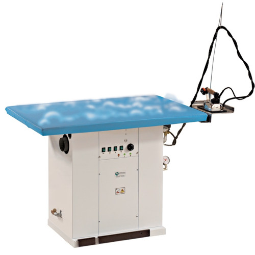 Žehlící stůl s typem desky 80x170 cm pro stabilizaci pletenin s automatickým vyvíječem páry. Příkon vyvíječe 12 kW, napařování a odsávání žehlící desky 0,37 kW, vyhřívání žehlící desky o příkonu 2,25 kW, výška pracovní plochy 90cm, napájecí napětí 400V, váha 140 kg, rozměr stolu při práci 82x192x94 cm, rozměr stolu v kartonu 1,7 m3.