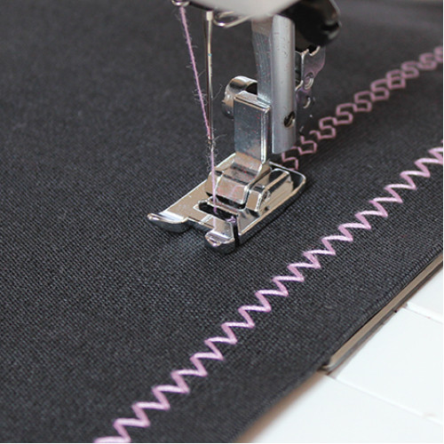 Patka pro šití hustým cikcakem. Spodní část nohy je skosená pro bezproblémové šití dekorativními, nebo saténovými stehy. Patka je kovová.