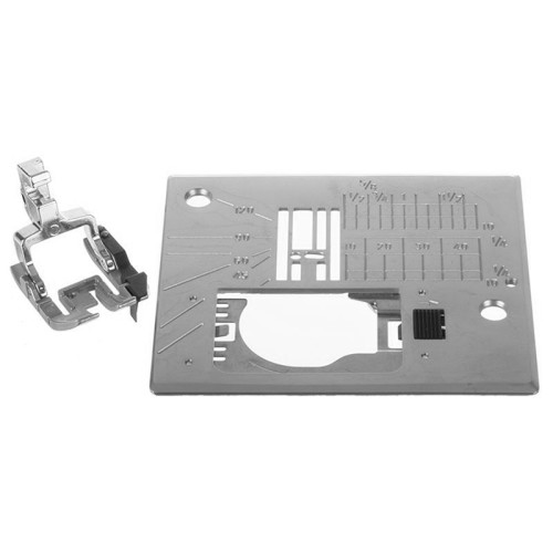 Speciální stehová deska pro rovné šití, při šití šikmo přes střiženou látku krásně stroj drží stopu a neuhýbá i přes švy (pro těžší materiály, speciální materiály). Dále má stehová deska otvor pro menší jehlu, takže nedochází k úhybu jehly a materiál perfektně provazuje a konce trojúhelníků se vám nenacpou do spodní díry. Součástí je patka s vodičem a jehelní deskou 1/4", díky které perfektně vidíte šitý materiál, i když používáte horní přídavné podávání. Velmi populární pro patchwork.